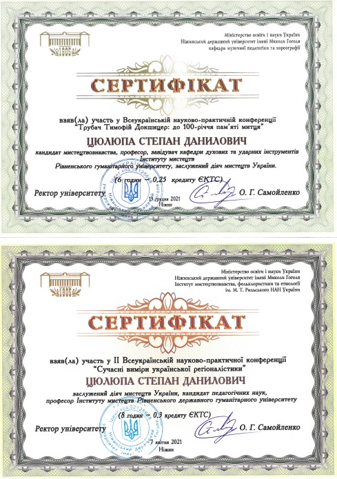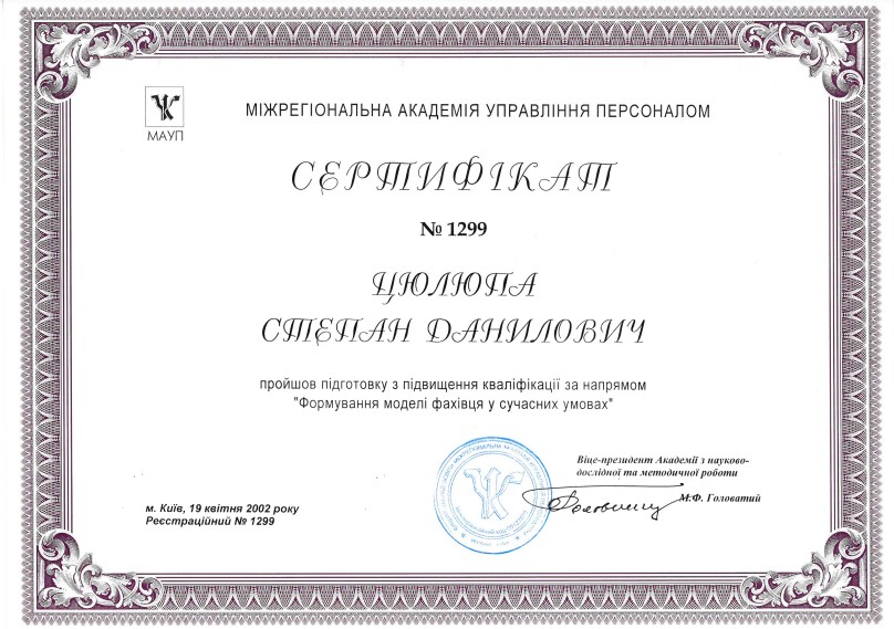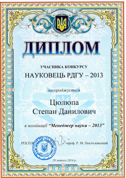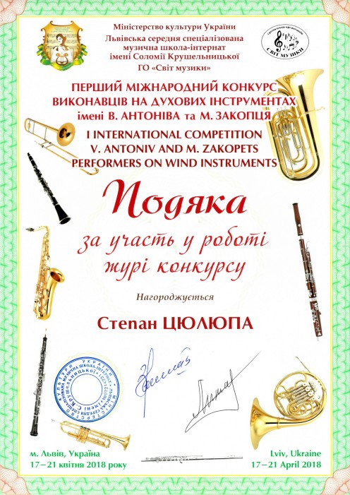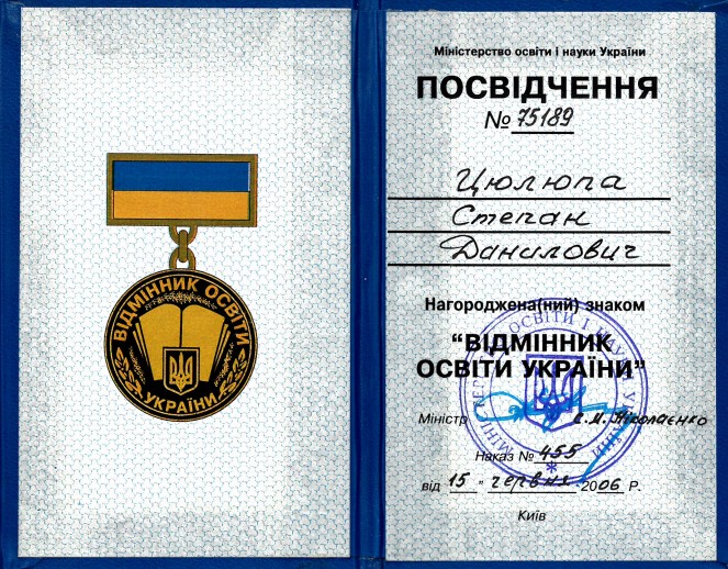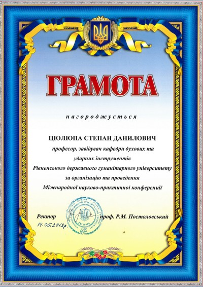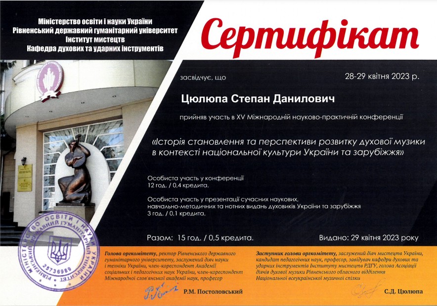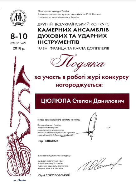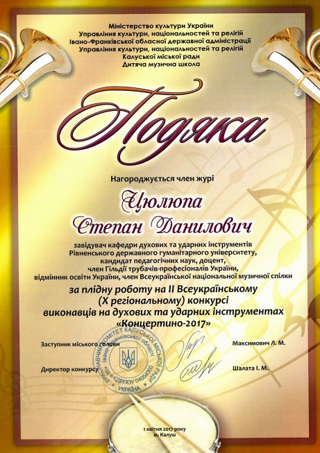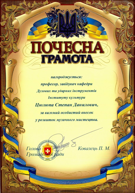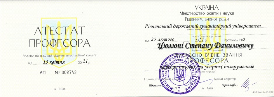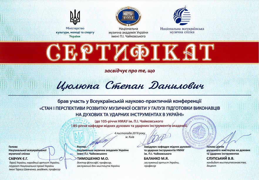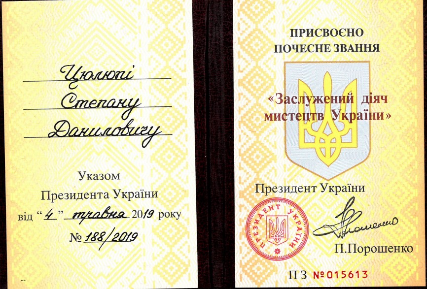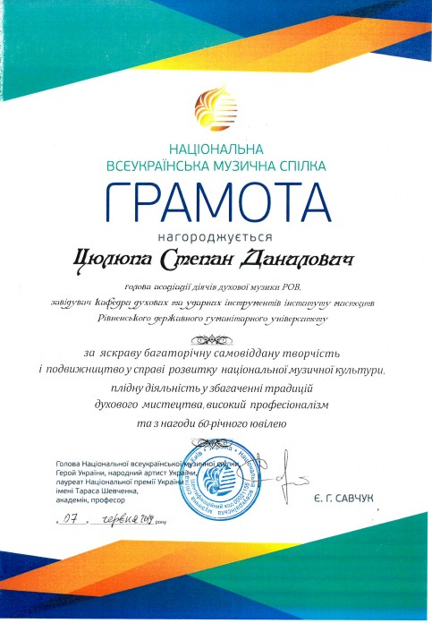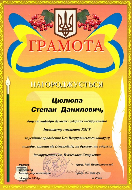 Цюлюпа Степан Данилович - заслужений діяч мистецтв України, кандидат педагогічних наук, професор, завідувач кафедри духових та ударних інструментів факультету музичного мистецтва Рівненського державного гуманітарного університету. Народився 17 травня 1959 р. с. Дем'янів, Галицького р-ну, Івано-Франківської обл. Кандидат педагогічних наук (2004), доцент (2006), професор (2021) відмінник освіти України (2006), лауреат обласної мистецької премії імені Германа Жуковського (2017), заслужений діяч мистецтв України (2019). З 1970 р. до 1974 р. навчався в Бурштинській дитячій музичній школі (клас труби Р.І. Федоріва). З 1974 р. до 1977 р. – студент Львівського училища культури (клас труби Д.Д. Фенюка), кваліфікація – керівник духового оркестру, культурно-освітній працівник; з 1977р. до 1979 р. – музикант військового оркестру Прикарпатського військового округу м. Яворів; з 1979р. до 1983р. – студент кафедри духових та ударних інструментів Рівненського державного інституту культури (клас труби ст. викладача О.Г. Садового, клас диригування заслуженого працівника культури України, доцента В.М. Старченка); з 2000р. до 2004р. – здобувач Київського національного університету культури і мистецтв. Захистив дисертацію в 2004році і здобув науковий ступінь кандидата педагогічних наук зі спеціальності 011 Науки про освіту, 13.00.06 – теорія і методика управління освітою, науковий керівник – доктор філософських наук, професор Юрій Львович Афанасьєв. Рішенням Атестаційної колегії МОНУ 22 грудня 2006 року присвоєно вчене звання доцента кафедри духових та ударних інструментів, з 2018 р. – професор кафедри духових та ударних інструментів. З 2004 р. – завідувач кафедри духових та ударних інструментів Інституту мистецтв Рівненського державного гуманітарного університету. Володар Гран-прі Всесоюзного конкурсу естрадної музики в 1981році у складі джаз-оркестру "Панорама" (керівник – Володимир Шварцапель) Рівненського міського будинку культури. Член Гільдії трубачів-професіоналів України з 2003р. З 2016 року голова Асоціації діячів духової музики Рівненського обласного відділення Національної Всеукраїнської музичної спілки. Член комітету управління культури і туризму Рівненської обласної державної адміністрації з присвоєння обласної мистецької премії імені Германа Жуковського. Член атестаційної комісії управління культури і туризму Рівненської обласної державної адміністрації. Творча діяльність здійснювалась у складі тріо та квінтету мідних духових інструментів кафедри, в творчих звітах кафедри та програмах симфонічного оркестру Рівненської обласної філармонії, з 2004 – 2019 рр. на посаді артиста естрадно-симфонічного оркестру Рівненського обласного академічного українського музично-драматичного театру. Мистецькі програми реалізовувались на Всеукраїнських і Міжнародних конкурсах і фестивалях у Болгарії, Італії, Словенії, Македонії, Польщі та на теренах України. За період творчої діяльності реалізував наукові, навчально-методичні та мистецькі проекти, а саме: • директор Всеукраїнського конкурсу молодих виконавців (ансамблів) на духових та ударних інструментах ім. В’ячеслава Старченка в 2005 - 2025 рр., м. Рівне; • ініціатор та організатор проведення Всеукраїнської науково-практичної конференції "Історія становлення та перспективи розвитку духової музики в контексті національної культури Укр